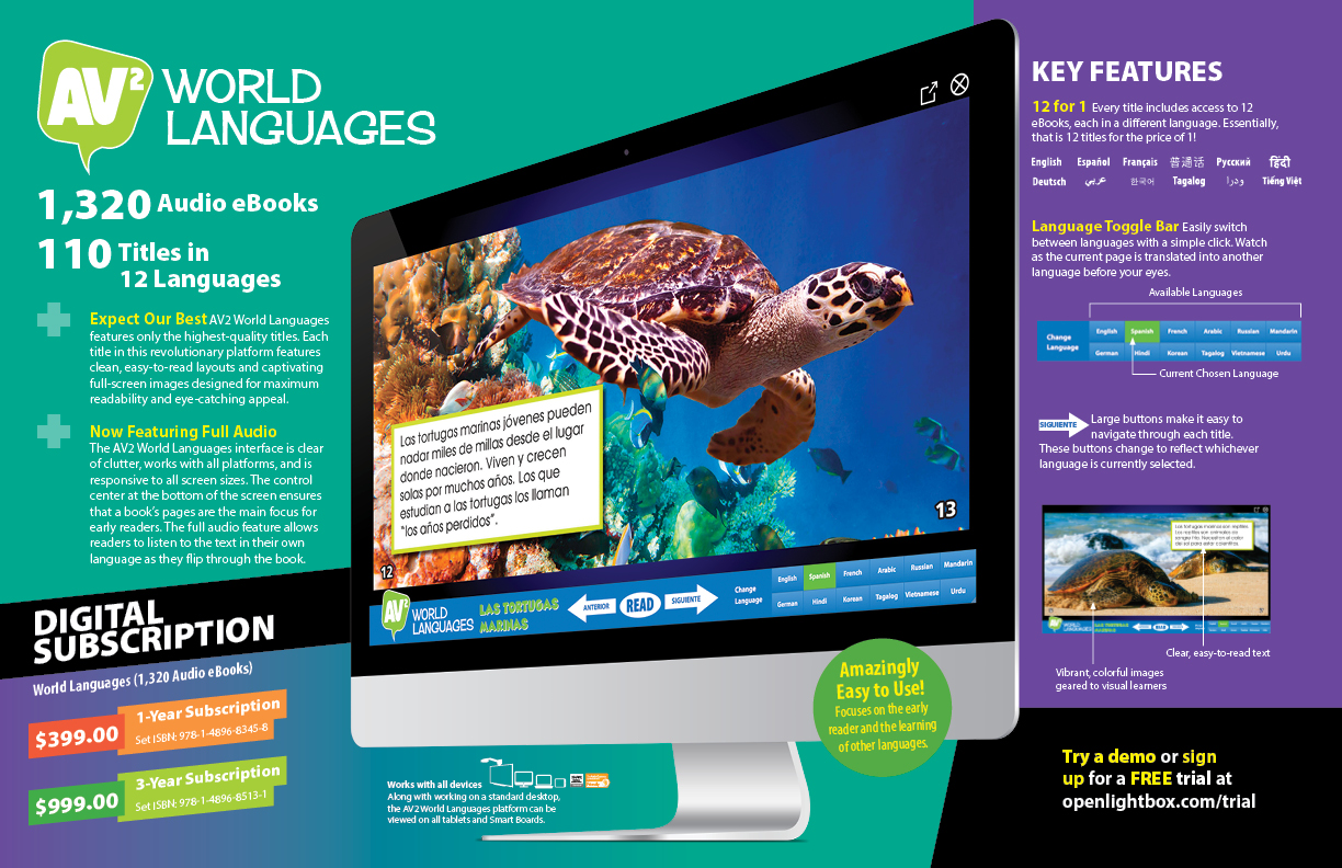 AV2 World Languages features only the highest-quality K-2 titles. Each title in this revolutionary platform features clean, easy-to-read layouts and captivating full-screen images designed for maximum readability and eye-catching appeal. Every World Languages title is available in 12 different languages, with additional titles being added every year. Users can easily switch between languages with a simple click to get a bilingual experience.