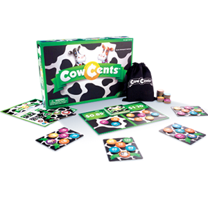 MOOOVE your Money Tokens to the money pool to match the amount on the Goal card and the Money Tokens are yours! Don’t worry if you can’t make a total match, you can cash in your Cow Token and the pool is yours! Have the Money Tokens with the most dollar value at the end of the game and win!