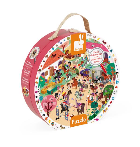 Janod Hat Box Observation Puzzle - Galloping Horses keeps a young equestrian busy for hours! After building a 208-piece puzzle featuring a very busy horse show, they can look at the objects in the border and try to locate them in the main image. The Janod Hat Box Puzzle series is made of sturdy cardboard and well-loved around the world! The box has a handle attached so you can take it wherever you go! Includes a 19.5in. Round 208-piece puzzle.
