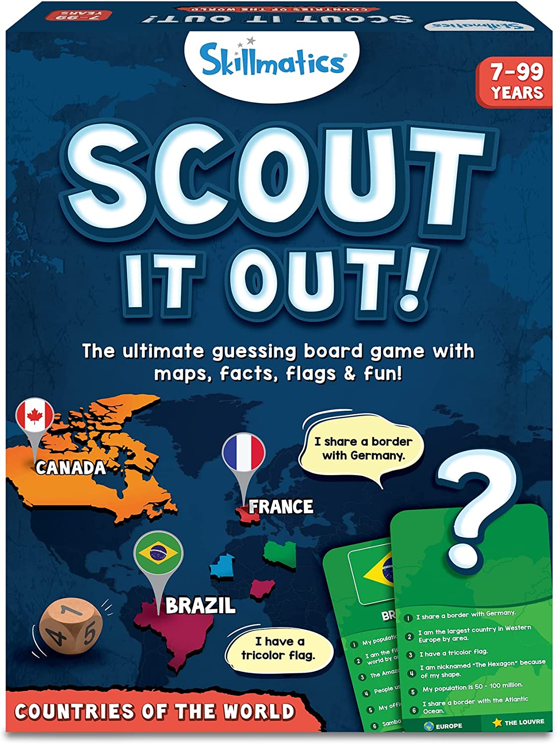 Scout It Out! Countries of the World is an adventurous and trivia-packed board game that will take you around the world. Roll the die to get clues and learn fascinating facts about countries around the globe. In this game of rotating clues, you must be the first player to guess the correct country to win the Game Card and a Bonus Token. The first player to collect 5 Game Cards wins the game! Think hard, pay very close attention to what others say, and make smart guesses! With an easy setup and rules, it doesn't take long to start your first round. Game includes 1 World Map, 1 Map of Europe, 74 Country Cards, 35 Bonus Tokens, 1 Wooden Die, 1 Cloth Bag and 1 Instruction Manual.
