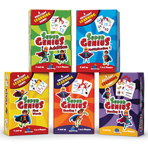 Super Genius is a new collection of educational matching games developed so that parents and teachers can help their little learners practice important academic concepts in fun and engaging ways. Depending on the version you choose, you will be looking for a match between an image to a word, or a mathematical equation to its product or sum. But the brilliant formula used in these games means that there will always be one and only one match between any two cards. All included in a convenient box for storage and travel.