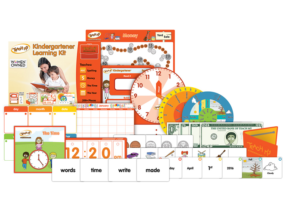 Teach My Kindergartener is our newest all-in-one learning kit designed for ages 4+. The kit contains unique and coordinated tools to teach spelling, money, telling time and the year. Your kindergartener can master 100 spelling words, counting money, analog and digital time as well as days of the week, months of the year, dates, years, weather and seasons. Each set in the kit is fully coordinated to encourage matching and repetition. Teach My Kindergartener is designed to be screen-free, one-on-one learning time. The kit aims to promote school readiness and a head start for kindergarten, in just 20 minutes a day.