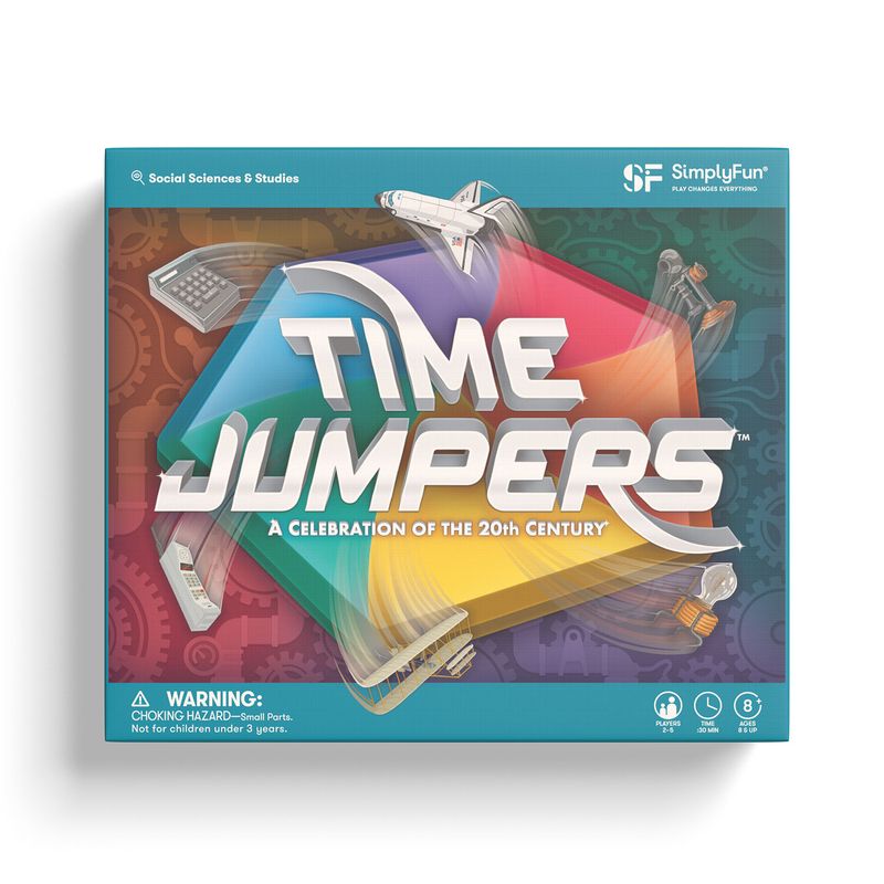 Go back in time to witness some of the greatest achievements, discoveries, and events of the 20th century. Players take turns moving around the category portal to collect cards and fill their dashboards with cards in chronological order to meet certain goals like collecting a card from each category or having the largest time span between two cards. Players earn points based on these goals and the player with the most points at the end of the game wins! Time Jumpers can be played by 2-5 players ages 8+ in 30 minutes.