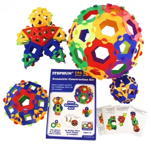 The ITSPHUN Construction set is a system of geometric shapes that can be combined in endless ways to make wonderful and colorful creations at the intersection of art and mathematics. The set contains 104 pieces along with cards with models of geometric solids (Platonic, Archimedean, Johnson, nonconvex solids, prisms, etc.) as well as ideas for more free-form, creative constructions. Educational and fun!
