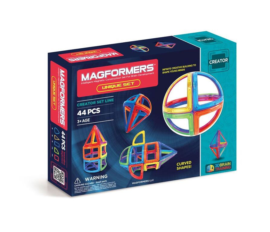 Design and build organic structures with curved 3D magnetic shapes with the all-new 44Pc Unique Set from MAGFORMERS®. Use arches, cones and sphere sectors to build balls and towers. Combine your design with all MAGFORMERS® shapes and see where your imagination will take you!
