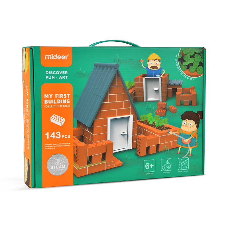 My First Building - Idyllic Cottage is a fun and STEAM educational toy that enables children to build structures and enjoy gardening. This toy helps kids develop their spatial skills and hands-on ability. With a detailed instruction manual included, children can build houses based on the models or their own ideas. This kit includes a packet of soil and a packet of seeds. Just add some soil into the planting trough, then sow the seeds and water it, to create a beautiful garden. The toy bricks are made of clay, the same as real bricks, to ensure a realistic tactile experience. In addition, we use natural and edible starch as cement to stick bricks together. After the house is built, just soak it in water for 2 hours and make starch dissolve in water, to separate the bricks which can be reused all over again.