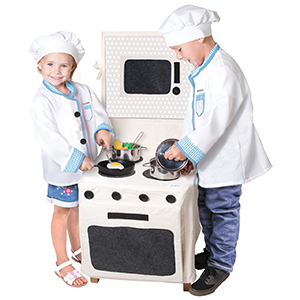 This clever product helps young children develop creativity, imagination, dexterity, fine motor skills, and encourages pretend play, which is essential for children to identify with the adult world. The product promotes emotional development by providing opportunities to express feelings and understanding through re-enactment. Empathy is also developed as children act out the part of somebody else, in this case, the cook.