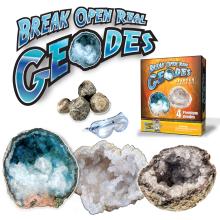 Break Your Own Geode Science Kit - Starter set of 4 Geodes! Crack open these real geodes and discover the amazing crystal treasure inside! This starter science kit includes 4 real geodes from 2 different mines so that you can discover a variety of crystal formations. This hands-on kit includes premium geodes that are guaranteed to have incredible crystals inside! Also included are safety goggles, a geode display stand, and a high quality information guide which will teach your young scientist all about geodes, and will allow them to identify the crystal formations inside. Plus there's an activity booklet with 10 additional puzzles, games and challenges. Science doesn't get any cooler than this! Winner of multiple awards for exceptional geode quality, educational materials, and play value!