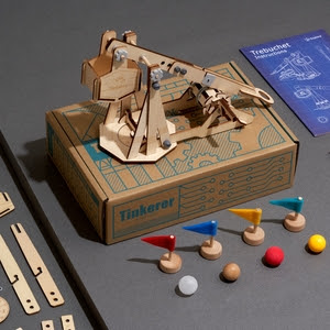 Tinkerer offers STEAM activities for curious minds. In our Explore box Trebuchet, you will construct and experiment with the Trebuchet. Fling objects across the room, track their trajectories and keep records of the variations you have made to assess your data. Learn about the transfer of potential energy to kinetic energy and discover the science behind the Trebuchet in the magazine.
