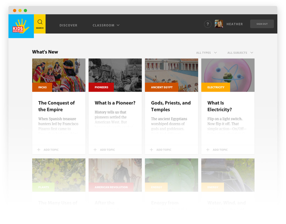 Kids Discover Online offers a Search by Standards feature for Educators and Parents to identify standards-aligned content for lesson integration. Articles can be saved/added to an Educator's virtual Classroom, where students can then visit for the day's lesson. Students can also access Kids Discover Online independently for homework help and student-led research.